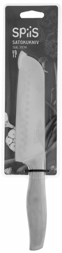 30 cm lang santoku-kniv i rustfritt stål og ergonomisk håndtak. Lommer i bladet hindrer at mat klistrer seg fast til bladet.