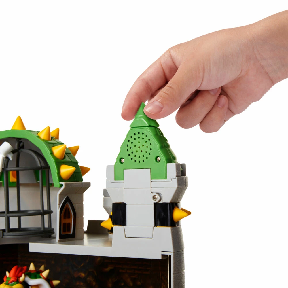 Super Mario™ DeLuxe Bowser`s Slott har flere deler i huset som er bevegelige og spiller musikk. Trykk på ett av slottets spir for lyder. Heisen kan beveges opp og ned, felledører kan slås ut for å slippe Bowser ut og ned i lavaen!