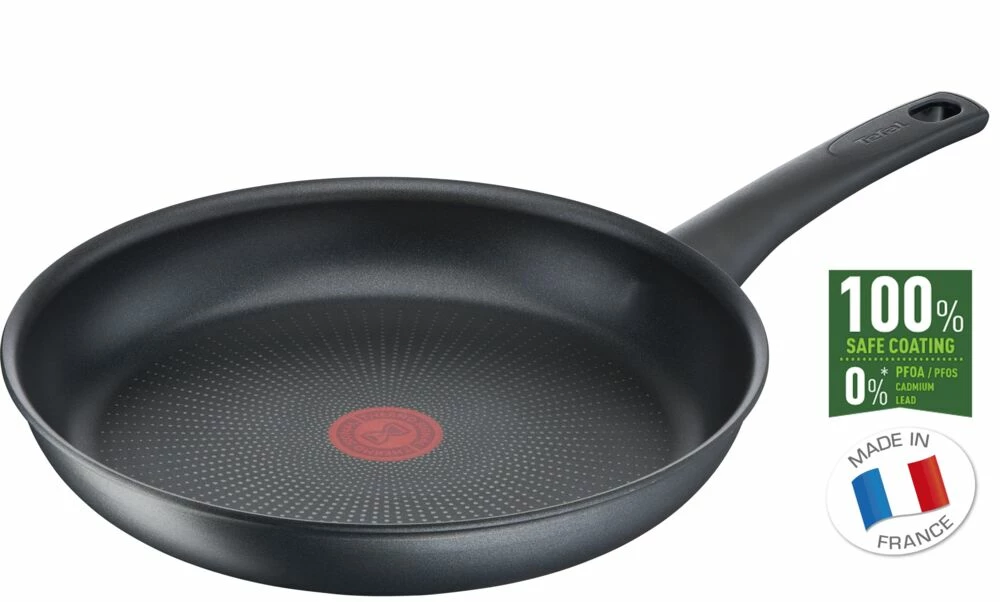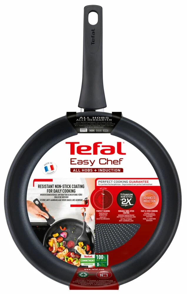 Med EASY CHEF-serien slipper du tunge, upraktiske kokekar og tidkrevende rengjøring i hverdagen. På innsiden har både pannene og grytene Non Stick-belegget TITANIUM, som har et ekstra lag som er forsterket med titanpartikler. Overflaten er derfor svært ripebestandig, noe som betyr at det varer lenger. Takket være slippbelegget blir det også enkelt å lage sunne måltider uten smør eller olje, og oppvasken etterpå går lekende lett. Hele serien er laget av et slitesterkt materiale som tåler daglig bruk, og induksjonsbunnen Thermo-Fusion™ sørger for hurtig oppvarming og jevn temperatur. Det er lett å lykkes med stekingen, fordi Tefals Thermo-Signal™ endrer farge når pannen har nådd optimal steketemperatur. EASY CHEF – gjør matlagingen i hverdagen praktisk og problemfri.