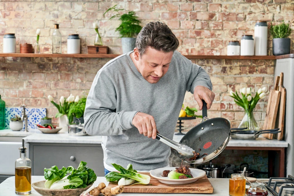 Tefal Jamie Oliver Quick&Easy stekepanne. Lag raske og gode måltider i hverdagen med disse robuste og lette kokekarene i rustfritt stål. Silikonhåndtaket gir et behagelig og trygt grep, samtidig som det holder seg kjølig. Thermo-Signal ™-teknologien angir når pannen har den perfekte steketemperaturen, så du ikke trenger å gjette.Designet av Jamie Oliver: «Dette er kjelene jeg bruker til å lage mat i hverdagen – de er slitesterke, av høy kvalitet og gir supre resultater hver eneste gang. Det er derfor jeg har samarbeidet med Tefal i nærmere to tiår. Vi vil begge at flere skal lage smakfulle næringsrike måltider fra bunnen av.»