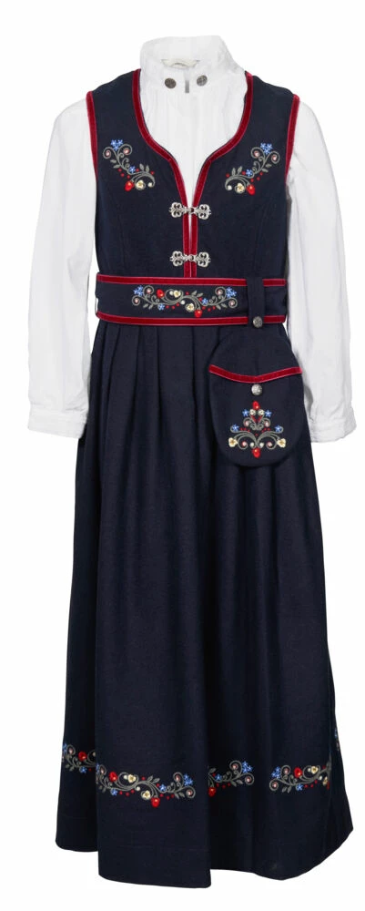 Festdrakt i lekkert blått ullstoff, med vakre blomsterbroderier. De vakre broderiene går rundt hele skjørtet, på bysten, bak på ryggen, samt på beltet. Beltet har nydelig kantebånd i fløyel. Beltet kan justeres i livstørrelse. Nydelig kantebånd i fløyel rundt ermåpning og halsåpningen. Tinnfargede hekter foran.