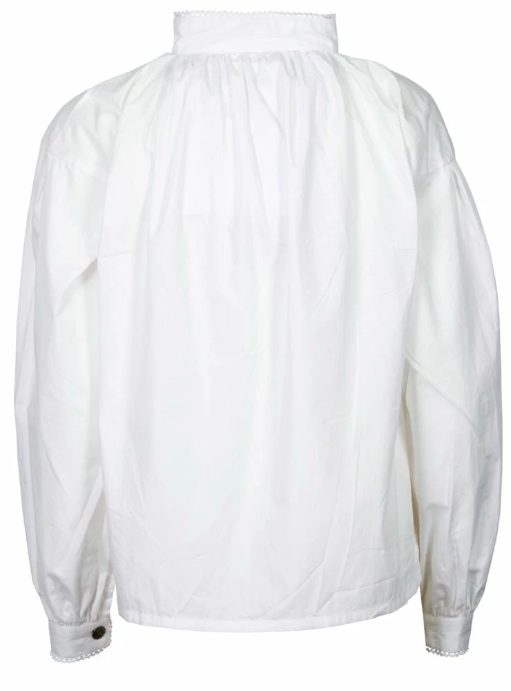 Nydelig bluse i 100% bomull, perfekt til festantrekket. Med brodert kanting på krage og skjortemansjetter, samt lekre tinnfargede knapper. Hempe i halsåpning. Str 36-48.