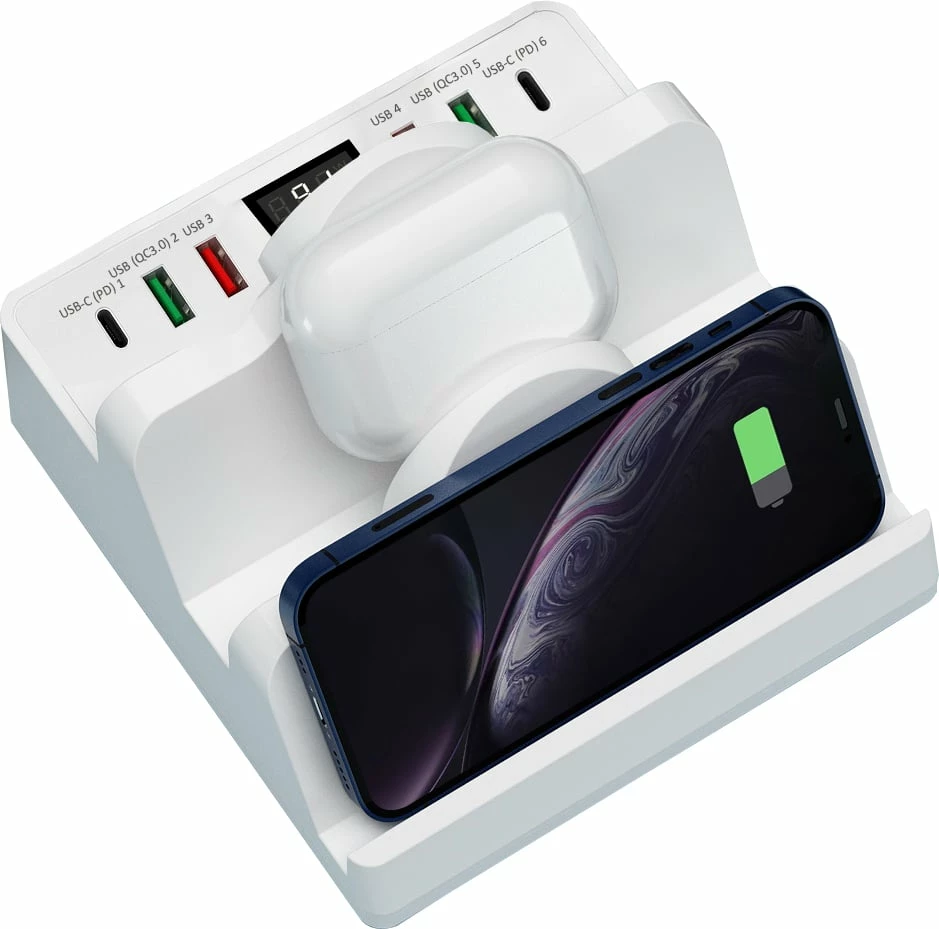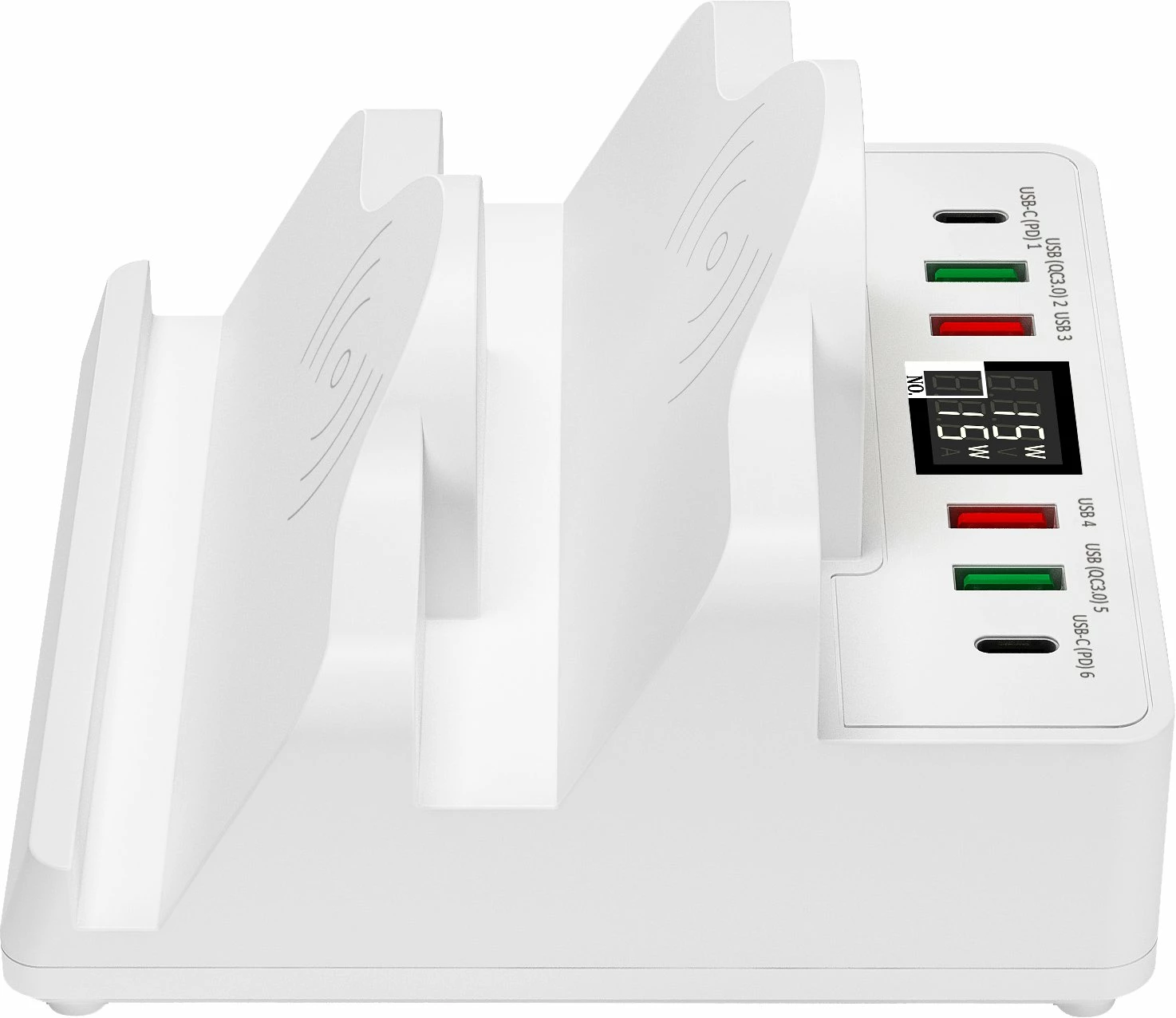 Produktnummer: 4895154358321 Kategorier: Elektronikk, Elektronikk og underholdning, Kabler og ledninger, Småelektronikk Stikkord: 2 x trådløse ladesoner, 2 x USB (QC 3.0), 2 x USB (Smart), 2 x USB-C (PD)