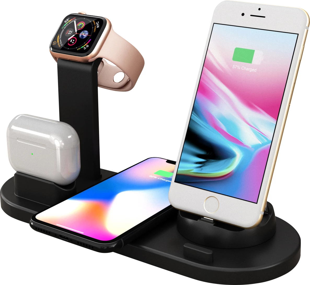 Ladestasjon med trådløs lader til QI-aktiverte smarttelefoner, Bluetooth ørepropper, smartklokker, smarttelefoner med 8-pin, micro-5-pin eller type-C ladeinngang